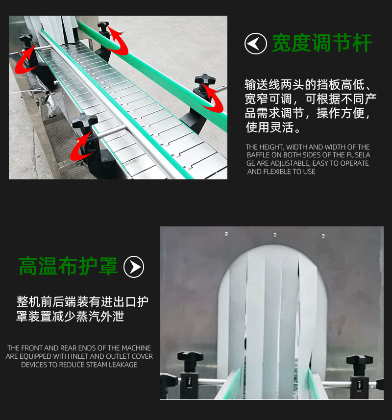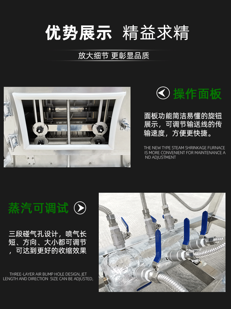 - 參數調整:根據機器的使用情況和包裝要求,定期檢查和調整蒸汽收縮機的參數。例如,檢查蒸汽溫度、傳送帶速度和蒸汽噴射時間等參數是否與實際包裝材料和產品相匹配。如果發現收縮效果不理想,如包裝材料收縮不緊密或出現褶皺,可以適當調整蒸汽溫度和噴射時間;如果產品在傳送帶上運輸不順暢,可以調整傳送帶速度。