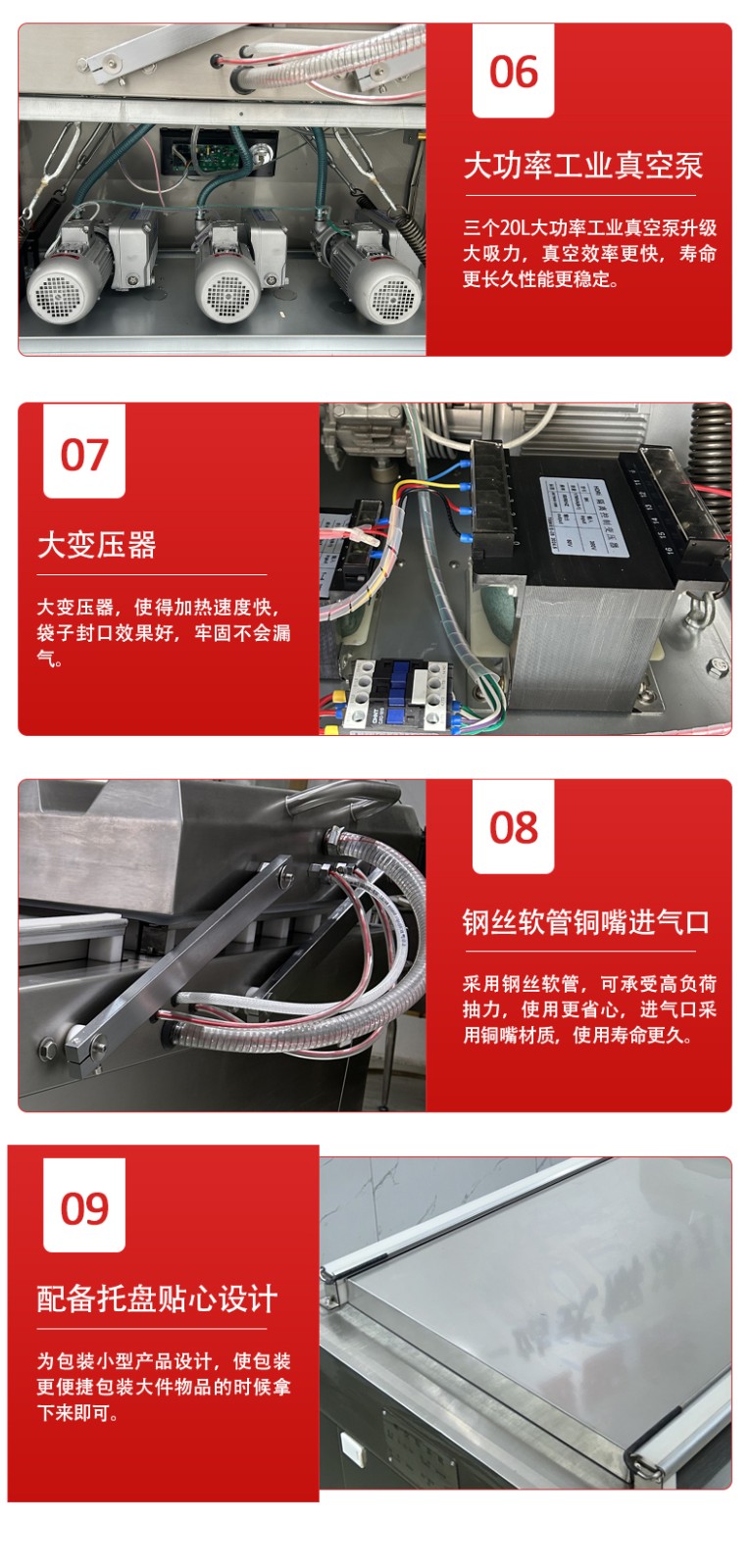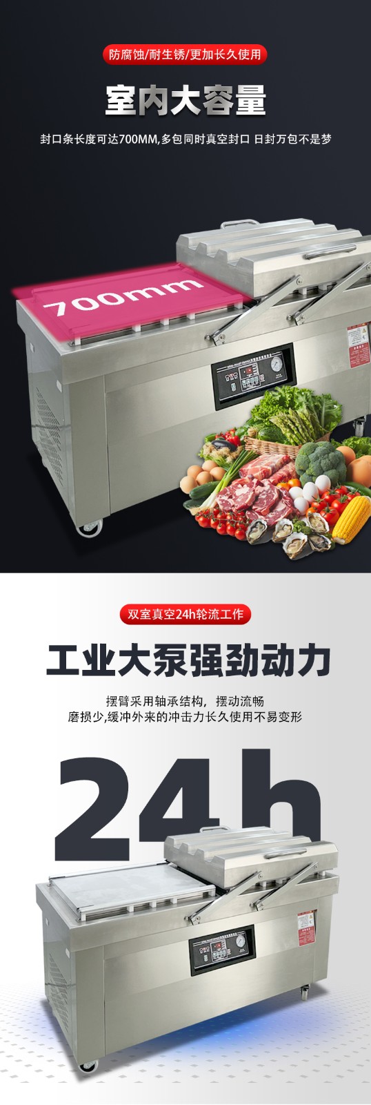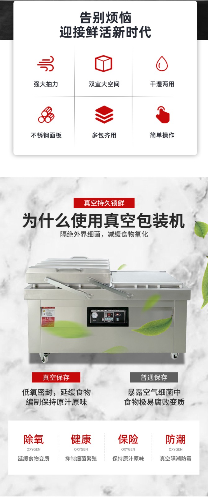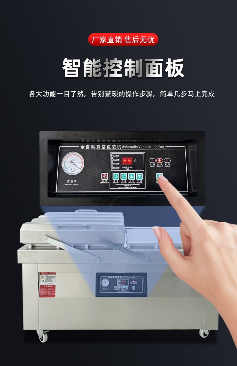 通過這種 “交替作業” 模式,雙室機無需等待單個室的完整流程結束即可開始下一批包裝,效率比單室機提升 60%-100%,同時雙泵 + 雙室獨立密封的設計,也保障了每一批次物料的真空度與密封性穩定。