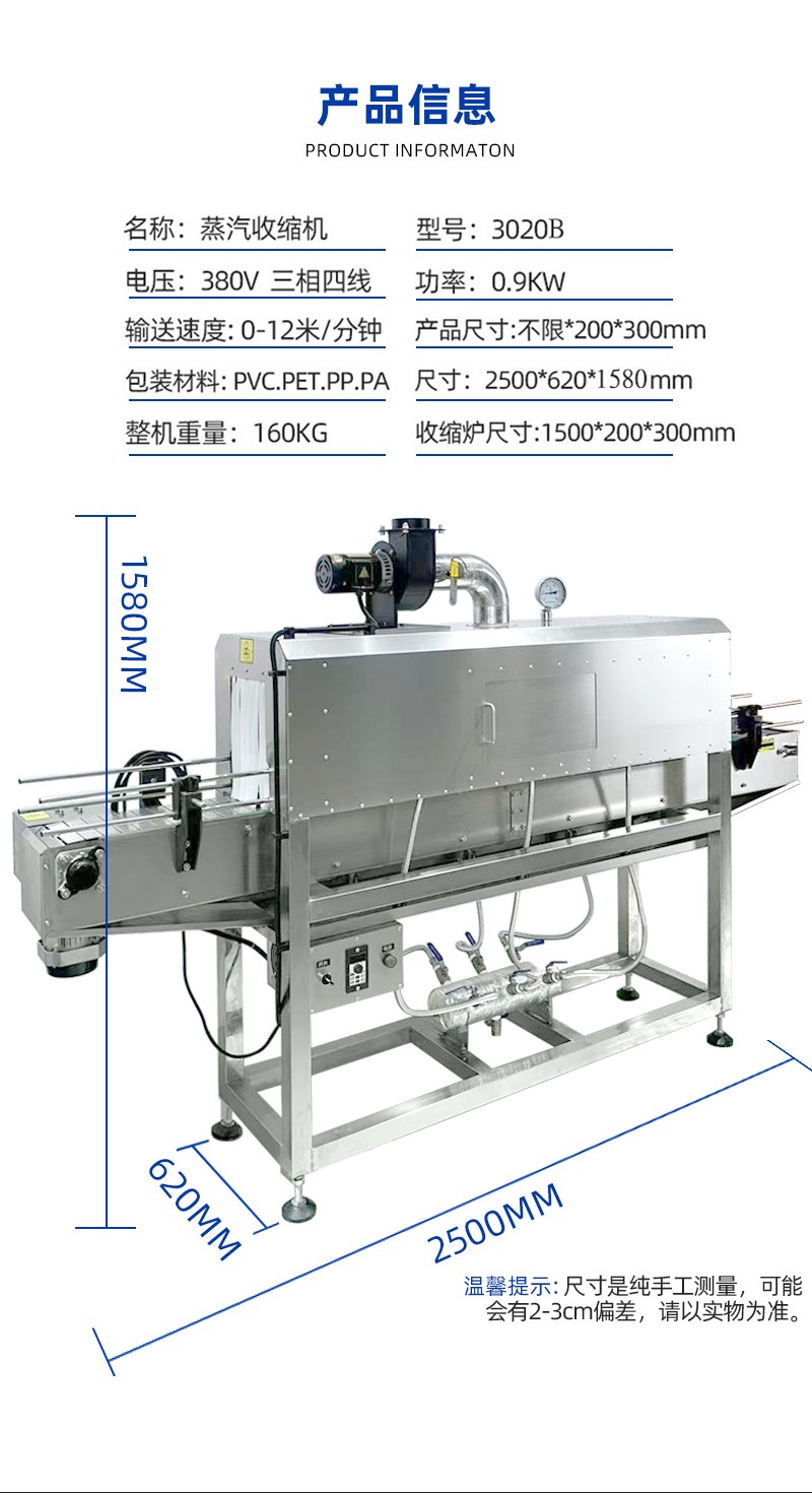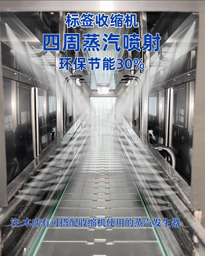 - 加熱效果優越:利用蒸汽恒溫且溫度擴散均勻的特性工作,能達到普通電熱紅外加熱收縮機不可比擬的效果。設備采用加熱器加熱水產生蒸汽,無需另外配備蒸汽鍋爐。主機有主副 2 個加熱器,可根據生產速度調節功率大小,輸送帶采用無級調速,輸送速度可任意調節。