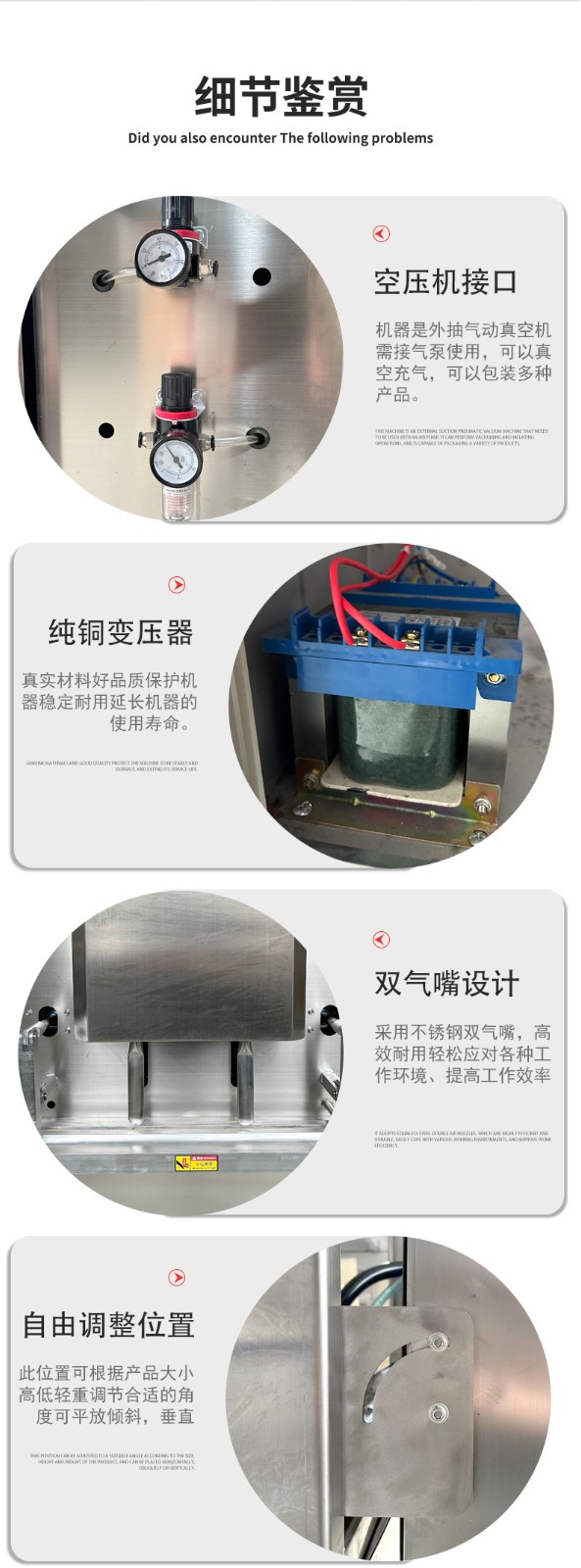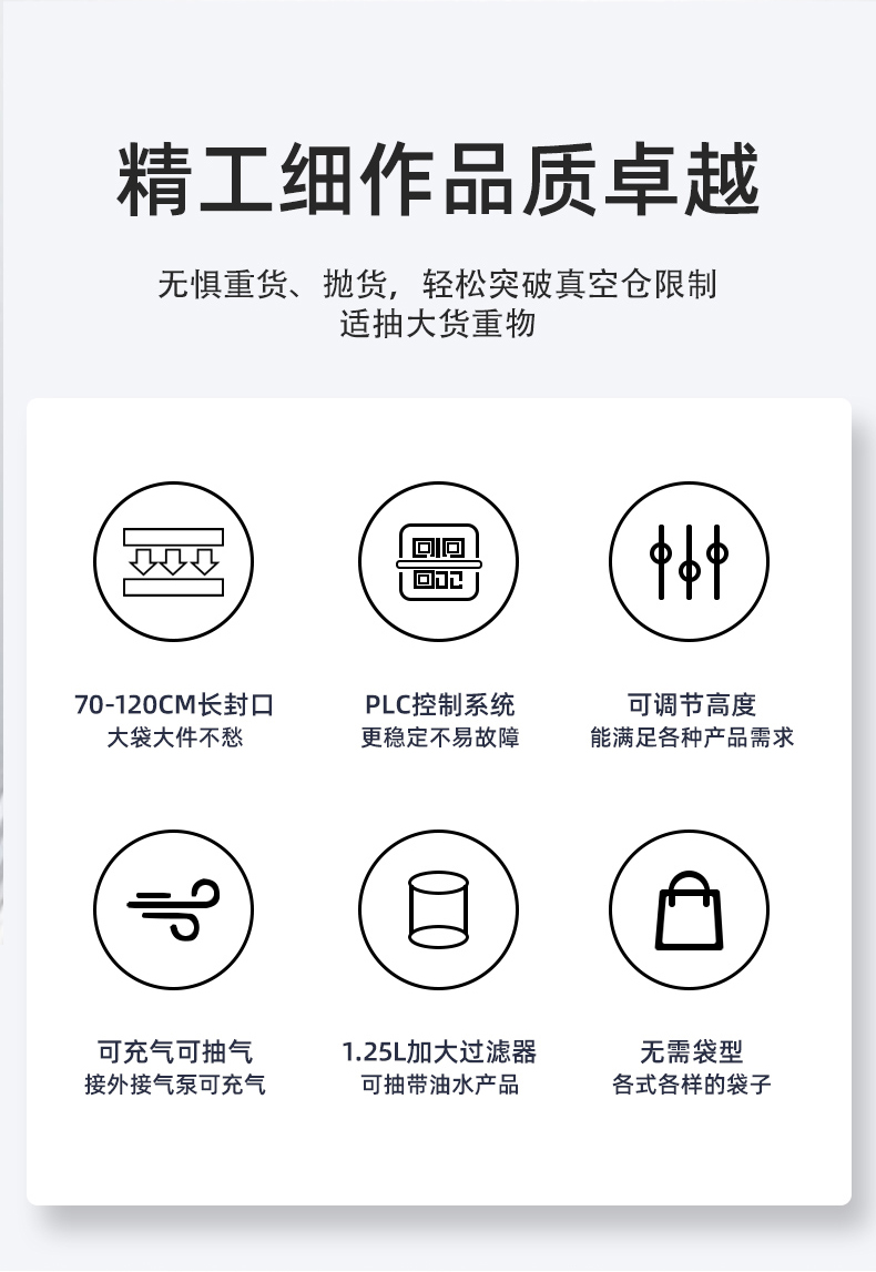 硬件適配保障:這類設備的外殼和真空室多采用不銹鋼材質(zhì),抗腐蝕、不易生銹,即便接觸醬料、海鮮等帶水分的物料,也能穩(wěn)定運行,且清潔方便,可避免潮濕環(huán)境對機器的損壞。部分機型還針對液態(tài)物料優(yōu)化了密封結構,防止包裝時液體滲漏影響設備部件。