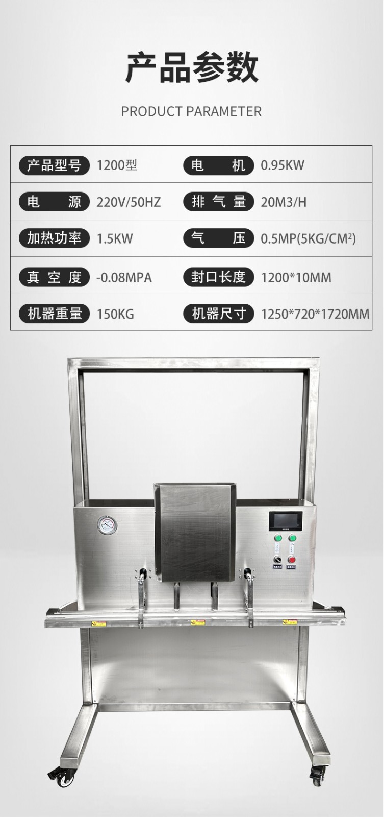 可定制與多模式適配不同尺寸:部分機型支持封口規(guī)格定制,封口長度可達到 800mm、1000mm 甚至 1200mm 等,適配不同寬度的包裝袋。同時,部分先進機型預設多組工作模式,可快速切換真空、充氣、封口等流程,適配從小袋糕點到大袋五金模具等不同尺寸、類型產(chǎn)品的包裝需求。