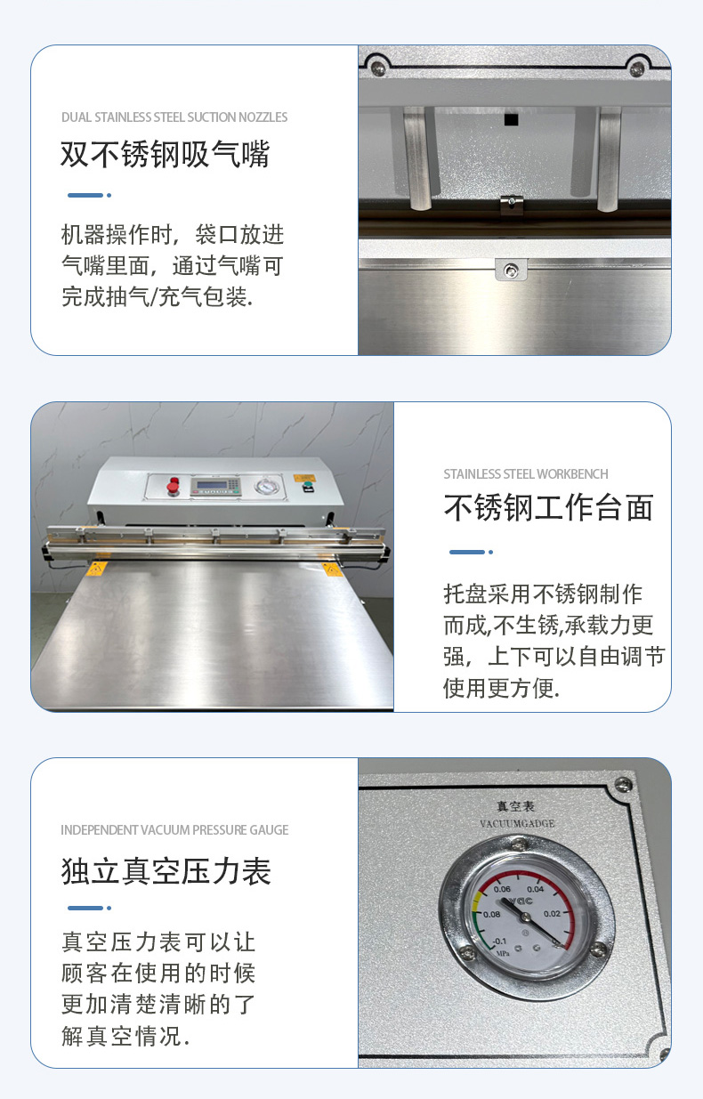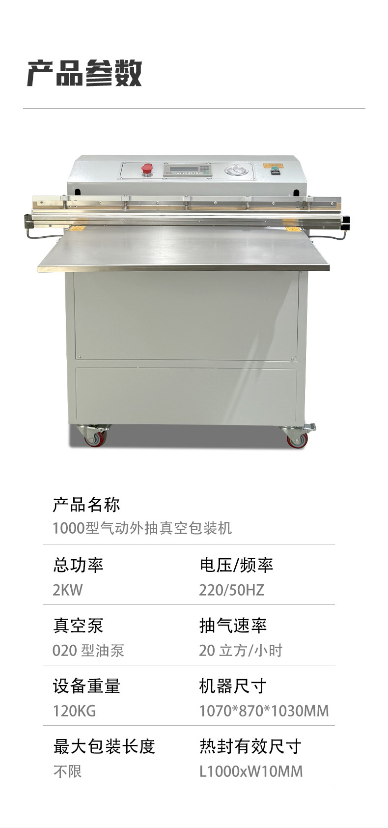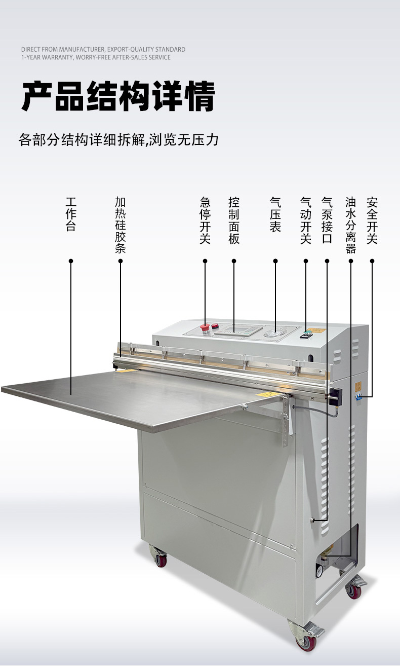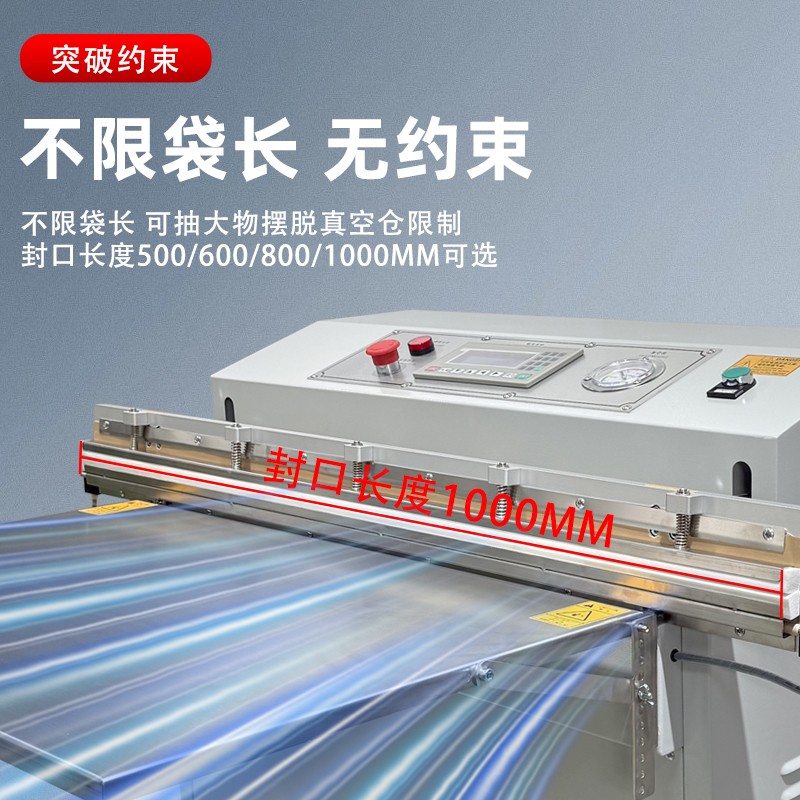 • 外抽真空包裝機的熱封條通常位于抽氣嘴下方或封口機構處,外部有金屬防護蓋(防止誤觸高溫)。