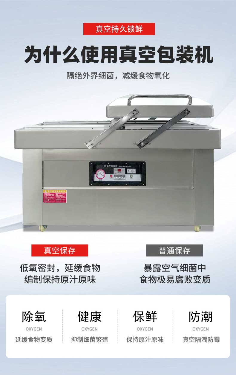 雙室真空包裝機可在真空包裝的基礎上,向包裝袋內充入氮氣、二氧化碳等惰性氣體或混合氣體,起到更好的防腐、防潮、防氧化等保質效果