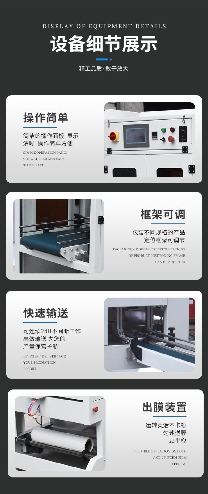 • 適用范圍廣:可以適應(yīng)多種產(chǎn)品的套膜需求。對于不同尺寸、形狀和重量的產(chǎn)品,只要在設(shè)備的規(guī)格范圍內(nèi),都可以進行套膜。同時,它也能夠使用多種類型的包裝薄膜,如 PE、PVC 等常見薄膜,企業(yè)可以根據(jù)產(chǎn)品的特性和成本等因素靈活選擇薄膜材料。