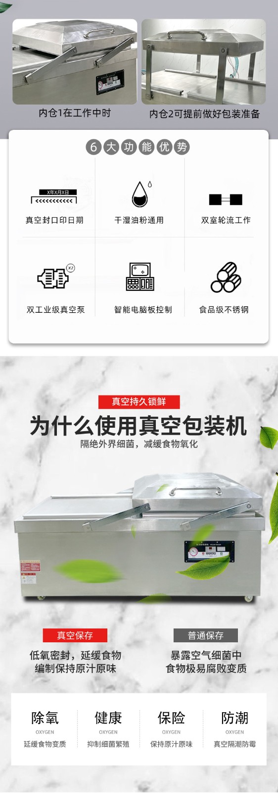 - 真空室:通常由不銹鋼制成,具有兩個對稱的工作室,可同時進行真空包裝操作,提高工作效率。工作室底部為平板狀,便于放置包裝物品,且易于清潔。