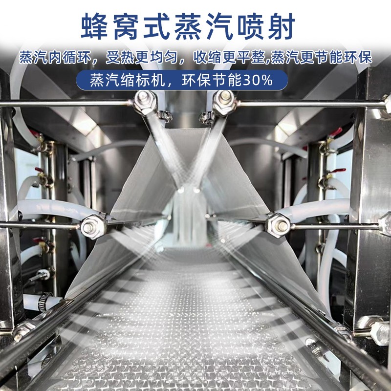 - 收縮效果均勻美觀收縮室采用環形蒸汽噴射設計,蒸汽能 360° 無死角包裹產品表面,使熱收縮膜受熱均勻,收縮后緊密貼合產品輪廓,無褶皺、無氣泡,即使是異形、棱角分明的產品(如五金工具、瓶裝飲料),也能實現平整光滑的包裝效果。